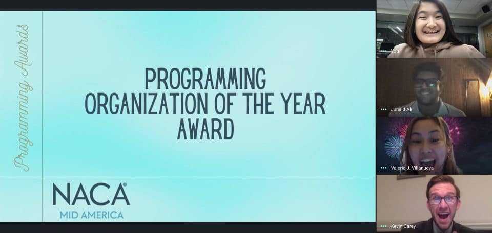 Kevin Carey ’13, Director of Student Involvement and Regional Leadership Team Chair for the NACA Mid-America Region, praised the accomplishments of CAB executive teams during a tumultuous year. “This is such an achievement in a time where much transition has happened around us globally and also internally as the group navigated a new board structure, virtual/hybrid/in-person programming, and continued to find new ways to engage students through different types of programs.”