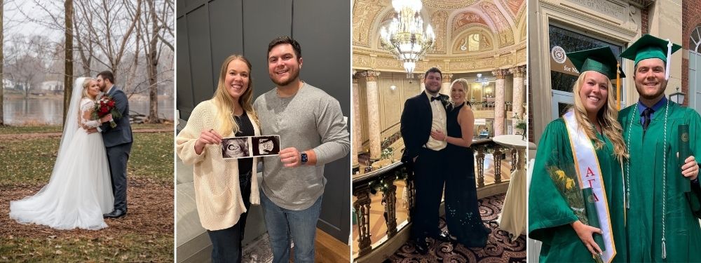 Although they met early in their college years, they didn’t move pass acquaintances until later in college. Two of Joe’s best friends and baseball teammates had a triplet sister who was best friends with Elizabeth through AGD. They ended up at the same hang outs almost every weekend and finally became friends. Joe says he was smitten from the beginning, but their relationship didn’t stat til the end of their junior year in 2018. The couple married in Yorkville, IL in 2022 and are expecting their first child in July! Joe and Elizabeth are grateful for IWU for so many reasons, but especially for meeting each other.